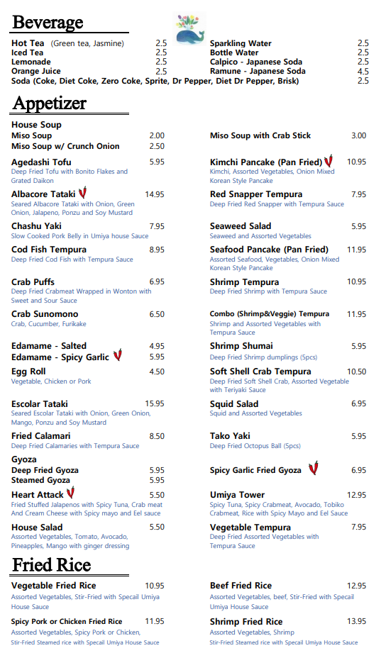 Welcome to Umiya Sushi, a cozy gem located in Cedar Park, TX, offering a delightful dive into Japanese cuisine. Their menu features an impressive array of sushi, from the melt-in-your-mouth Fatty Tuna to the iconic California Roll, crafted carefully to ensure freshness and flavor. Vegetable lovers can indulge in various options like the Avocado Roll and the delightful Vegetable Roll.